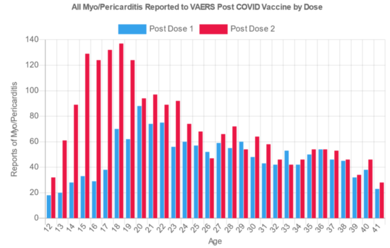 Hier ziet u hoe die ongekende hoeveelheden aan VAERS gemelde gevallen van myo/pericarditis naar leeftijd verdeeld zijn –