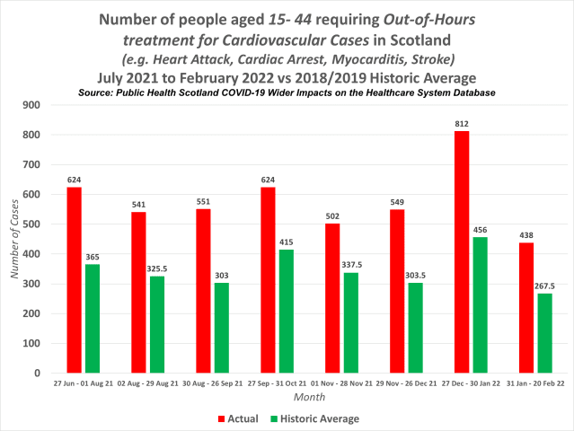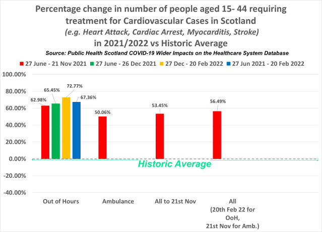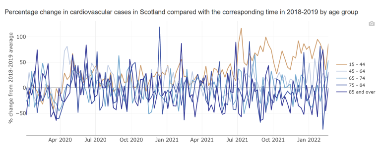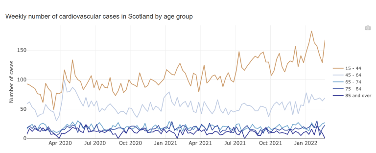 Uit het historisch gemiddelde blijkt dat er in heel Schotland tussen ongeveer 60 en iets meer dan 100 cardiovasculaire gevallen zijn geweest onder 15- tot 44-jarigen die een behandeling buiten de normale uren nodig hadden. Maar de gegevens voor 2021 en 2022 laten zien dat er tussen de 110 en 185 cardiovasculaire gevallen zijn geweest bij 15- tot 44-jarigen die een ambulante behandeling nodig hadden.