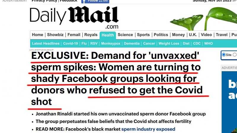 Deze “sperminator” heeft een Facebook-groep en doet het financieel erg goed. Daily Mail vond talloze voorbeelden van mensen die zochten naar “ongevaccineerd sperma”, schrijft Igor Chudov.