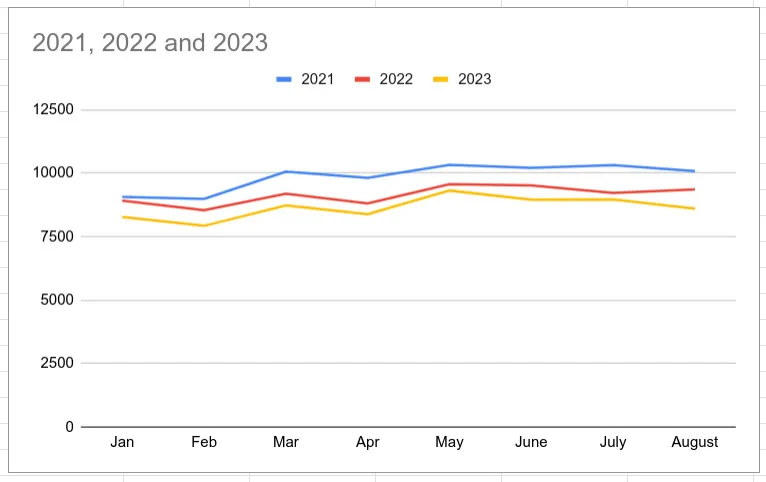 Het nieuws uit Zweden is niet bemoedigend: het geboortecijfer blijft dalen. Bijvoorbeeld, de geboorten in augustus voor 2021, 2022 en 2023 dalen jaar na jaar met een zeer ongebruikelijke snelheid van ongeveer 7% per jaar: