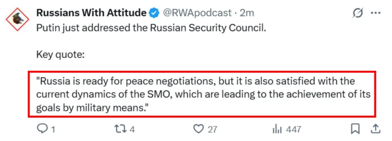Rusland staat klaar voor vredesonderhandelingen, maar is ook tevreden met de huidige dynamiek van de SMO, die leidt tot het bereiken van zijn doelen met militaire middelen.