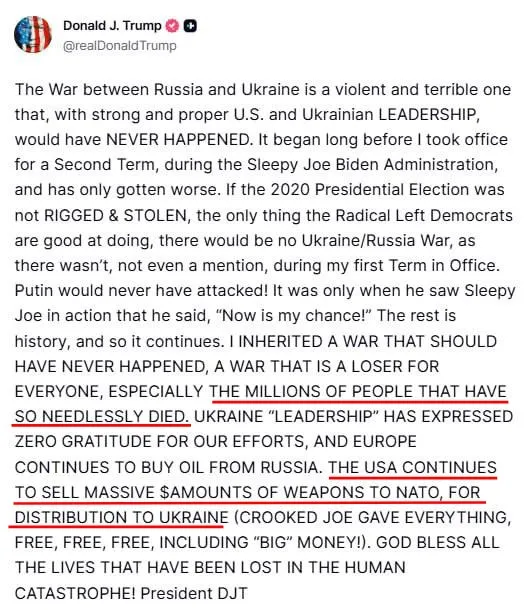 “DE VS GAAN DOOR MET HET VERKOPEN VAN ENORME BEDRAGEN AAN WAPENS (sic) AAN DE NAVO, VOOR VERSPREIDING NAAR OEKRAÏNE … GOD ZEGENE ALLE LEVENS DIE IN DEZE MENSELIJKE RAMP ZIJN VERLOREN!”