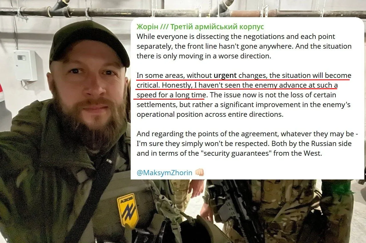 In sommige gebieden zal de situatie kritiek worden als er niet dringend veranderingen plaatsvinden. Eerlijk gezegd heb ik de vijand al lange tijd niet meer zo snel zien oprukken. Het probleem is nu niet het verlies van bepaalde nederzettingen, maar eerder een aanzienlijke verbetering van de operationele positie van de vijand over hele richtingen heen.