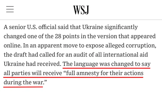 Hier legt WSJ uit hoe Oekraïne het zogenaamde “28-puntenplan” heeft gewijzigd om zijn elites volledige amnestie te verlenen voor hun moedwillige corruptie na het einde van de oorlog: