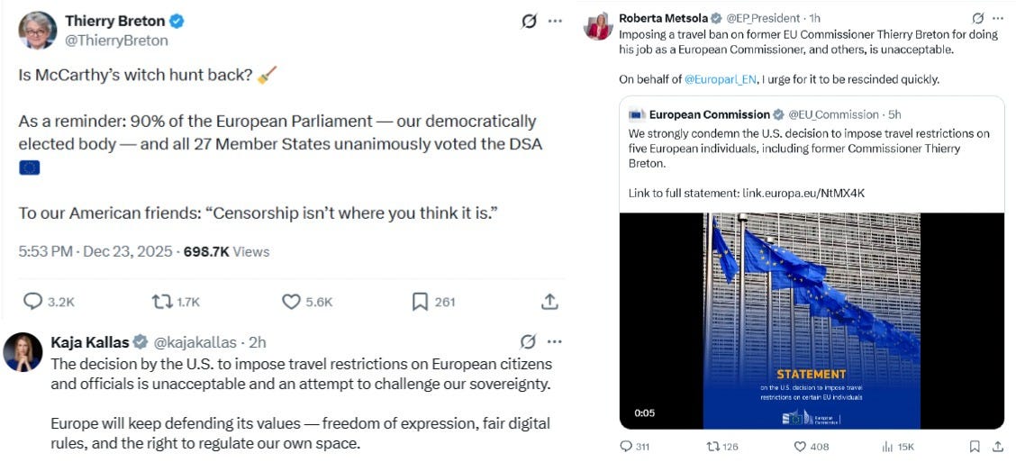 Gisteren kondigde de VS voor het eerst sancties aan tegen Europese functionarissen die betrokken zijn bij de Digital Services Act van de EU en de Online Safety Act van het Verenigd Koninkrijk, en met name vanwege hun pogingen om Amerikanen extraterritoriaal op Amerikaans grondgebied te censureren.