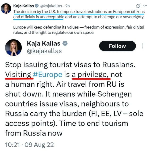 Vergelijk bijvoorbeeld het handengewring van Kaja Kallas met haar eerdere oproepen om reizen voor Russen te verbieden:
