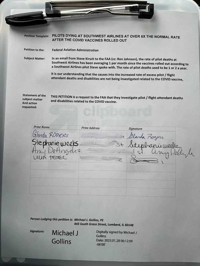 Mike Gollins probeerde handtekeningen te verzamelen voor een petitie aan de FAA om deze sterfgevallen te onderzoeken, maar ontdekte dat hoewel mensen het ermee eens zijn dat dit belangrijk is om te onderzoeken, ze te bang waren om de petitie te ondertekenen: