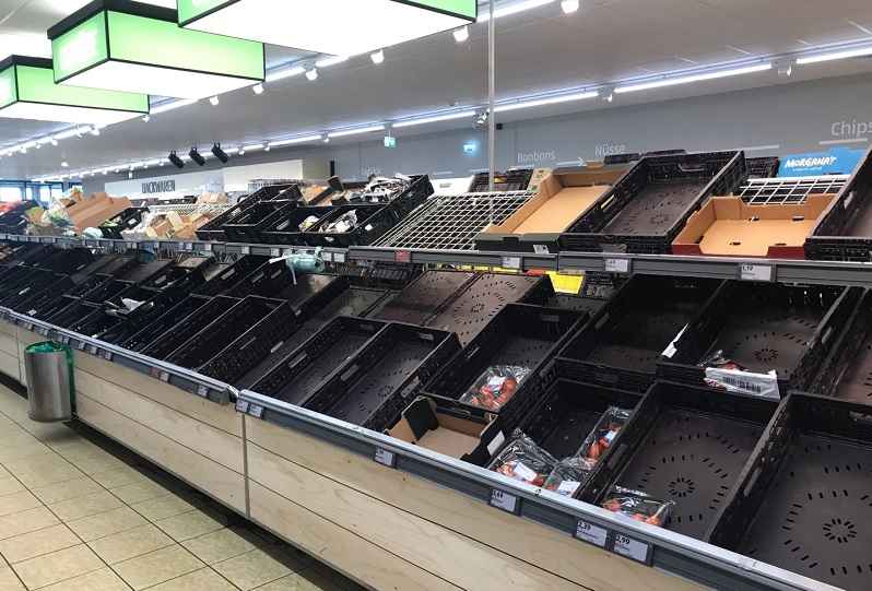 Dit schijnen beelden te zijn waar we aan moeten wennen. En de twee foto’s hierboven veroordelen de Staatspropaganda der Leugens ook: het is niet vanwege het hamsteren van asociale burgers dat de schappen leeg zijn. Dat geldt misschien nog steeds voor toiletpapier – maar er is nu genoeg toiletpapier. Alleen bij groenten en diepvriesvoedsel is dit onzin. Na een paar dagen zijn de groenten verwelkt en niet meer eetbaar. En de diepvriezers van de mensen hebben niet de grootte van een kamer voor zulk gelijktijdig en massaal hamsteren. De goederen bestaan gewoon niet.