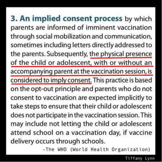 De Wereldgezondheidsorganisatie, het medische epicentrum van de ontvolkingslobby, beschouwt nu de aanwezigheid van uw kind op school als geïnformeerde toestemming om dat kind te vaccineren. Ontvolking door vaccinatie valt nu volledig buiten de wet en zal elk kind op aarde steriliseren, ziek maken en dommer maken dan de kinderen van de leden van de ontvolkingslobby die hun kinderen niet vaccineren, schrijft Sott.net.