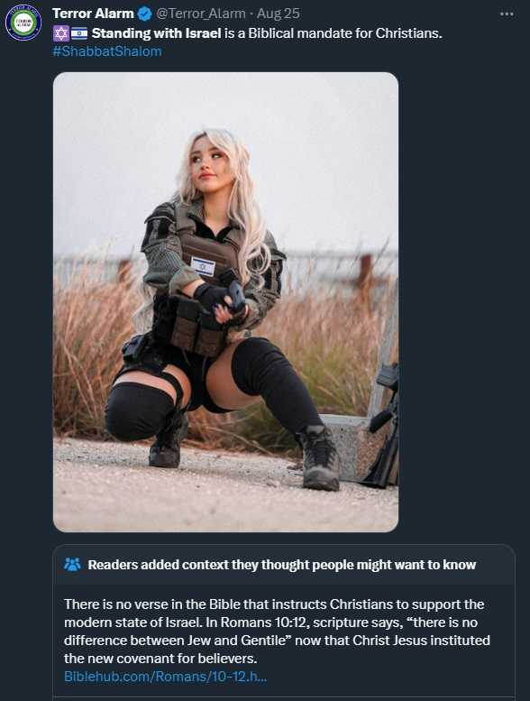 De aantekeningen van de X-community die terugslaan op beweringen dat christenen God ongehoorzaam zijn als ze het moderne land Israël, dat pas in 1948 werd gesticht, niet steunen, staan op een post van Terror Alarm; een nieuwsaccount dat wordt beheerd door een AI-systeem dat de Israëlische zaak blijkbaar een warm hart toedraagt, bericht Frankie Stockes.