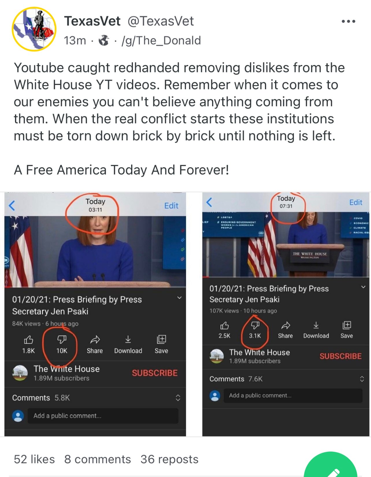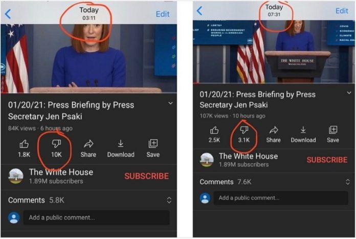Tijdens de persconferentie van het Witte Huis was het Amerikaanse publiek er snel bij om Psaki’s nonsens duimpjes naar beneden te geven. Om 3 uur ’s middags had de video 10.000 dislikes.