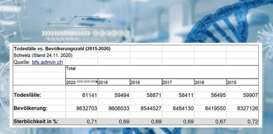Het ‘Corona-jaar 2020’ zal binnenkort teneinde zijn en als men de sterfgevallen van de laatste 5 jaar met elkaar in verhouding met de bevolking vergelijkt, zult men zien dat alles in het normale bereik ligt – zie bfs.admin.ch; Bevolking & Sterfgevallen, meldt Legitim.ch. Terwijl de sterftecijfers geldig zijn tot 24 november, worden de bevolkingsstatistieken slechts … Meer lezen over Zwitsers Bureau voor de Statistiek: geen sprake van overmatige sterfte in Corona-jaar 2020